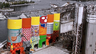 巨大的圓柱筒倉位于格蘭維爾島,這里是海洋水泥制造和分銷的總部。在完成過程中,工作人員測量到整件作品覆蓋面積高達7200平方米,巨型工業(yè)筒倉高23米的圓柱體公共藝術作品,為當地生活場所帶來全新的面貌,巨大的圓柱筒倉就坐落在世界著名的公共市場、艾米麗卡爾大學以及船舶碼頭旁,這里每年大約吸引1050萬游客。