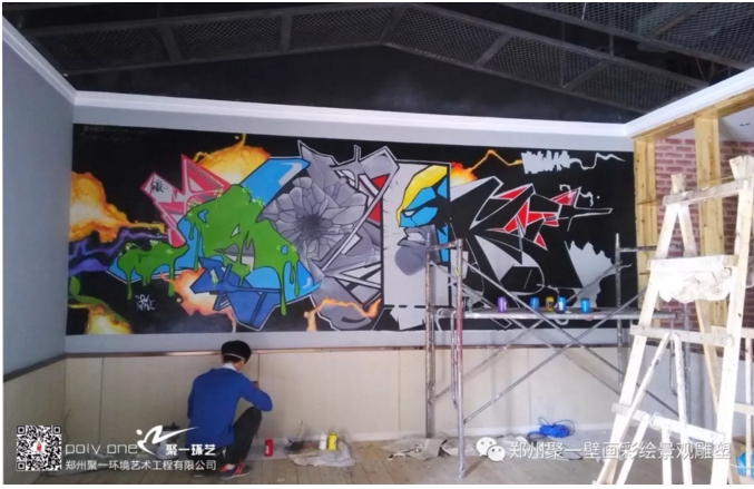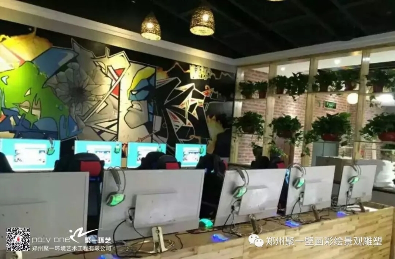 2015年5月鄭州游樂(lè)網(wǎng)吧裝修應(yīng)邀聚一彩繪進(jìn)行繪制,風(fēng)格結(jié)合了涂鴉的元素,彩繪的表現(xiàn)手法,再次拴釋了整體風(fēng)格。