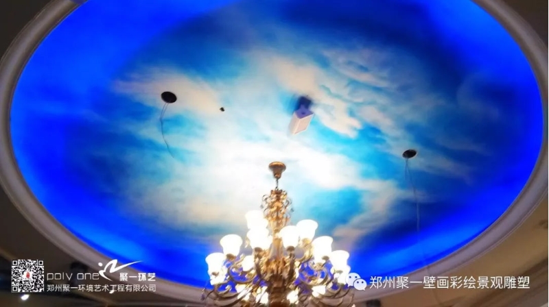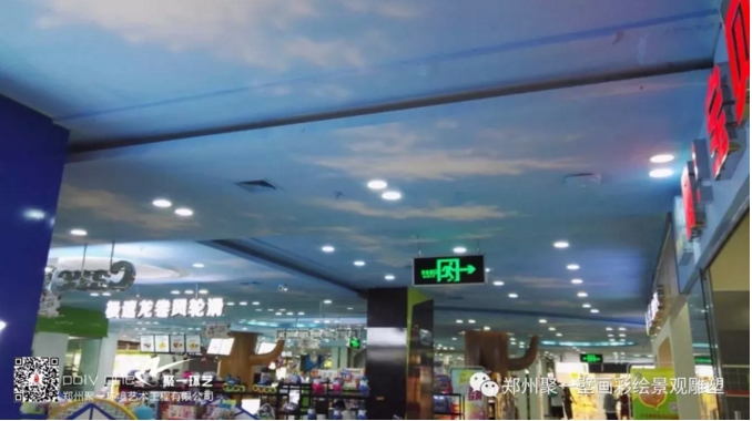 這是鄭州鑫苑·鑫都匯商場(chǎng)二樓的藍(lán)天白云彩繪,2017年7月聚一彩繪部進(jìn)場(chǎng)繪制,為了不影響白天營(yíng)業(yè),我們彩繪部畫(huà)師晚上通宵繪制,一千多平方精工繪制了兩周完成。